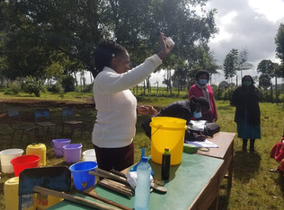 The effects of the program are being felt even at home. Parents became curious about the program, and reached out to teachers to learn more. The trainers therefore organized a training session on soap making for the parents at ‘Kibubuti Primary School’ and at ‘Limuru Mission Primary School’, and an impressive 100 parents participated in both sessions. Soap, so usually taken for granted, is something many families in the area cannot easily afford, although it is a key element for proper hygiene. The parents were therefore eager to learn how to make liquid soap so as to save the money they would otherwise use on commercial soaps and to earn some extra income. They were taught how to produce the soap in commercial quantities for sale to colleagues, friends, neighbours and local shops. The sessions were held in the open air, with masks on as a precaution during this time.